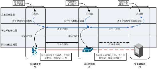 其身份鉴别可提供对身份合法性的验证,其平台鉴别可提供对平台安全状态的评估,包括对平台中各个组件的完整性、运行状态、端口状态、补丁状态等的评估,可确保网络连接两端设备的平台是可信赖的。