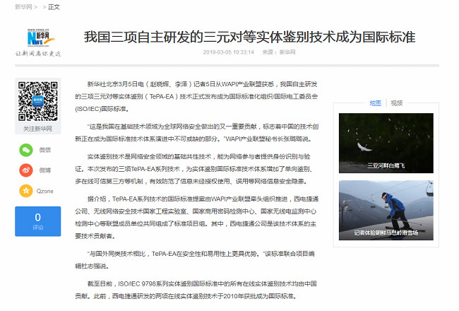 来自新华社:我国三项自主研发的三元对等实体鉴别技术成为国际标准